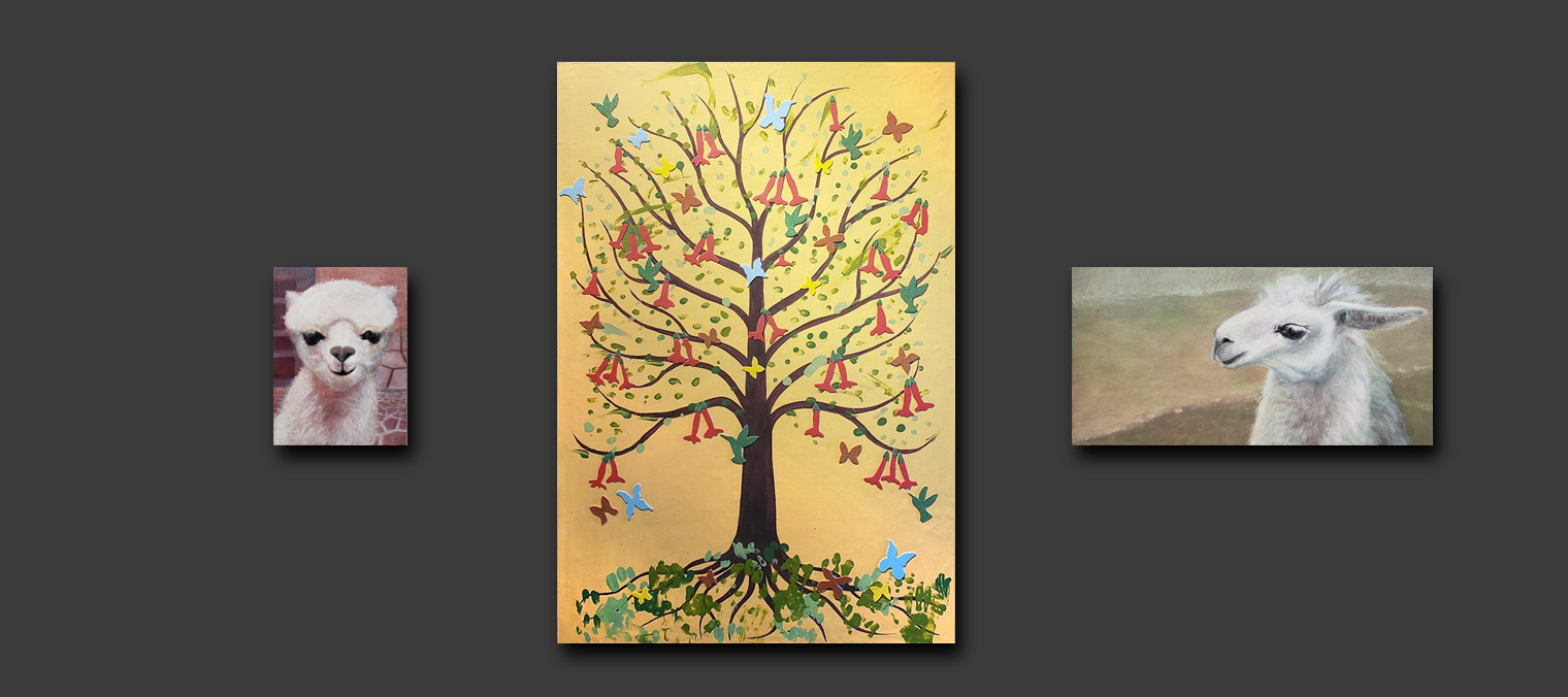 Below you can see the piece we created together with the students, along with my own contribution to the auction; portraits of an alpaca (left), and a llama (right).
